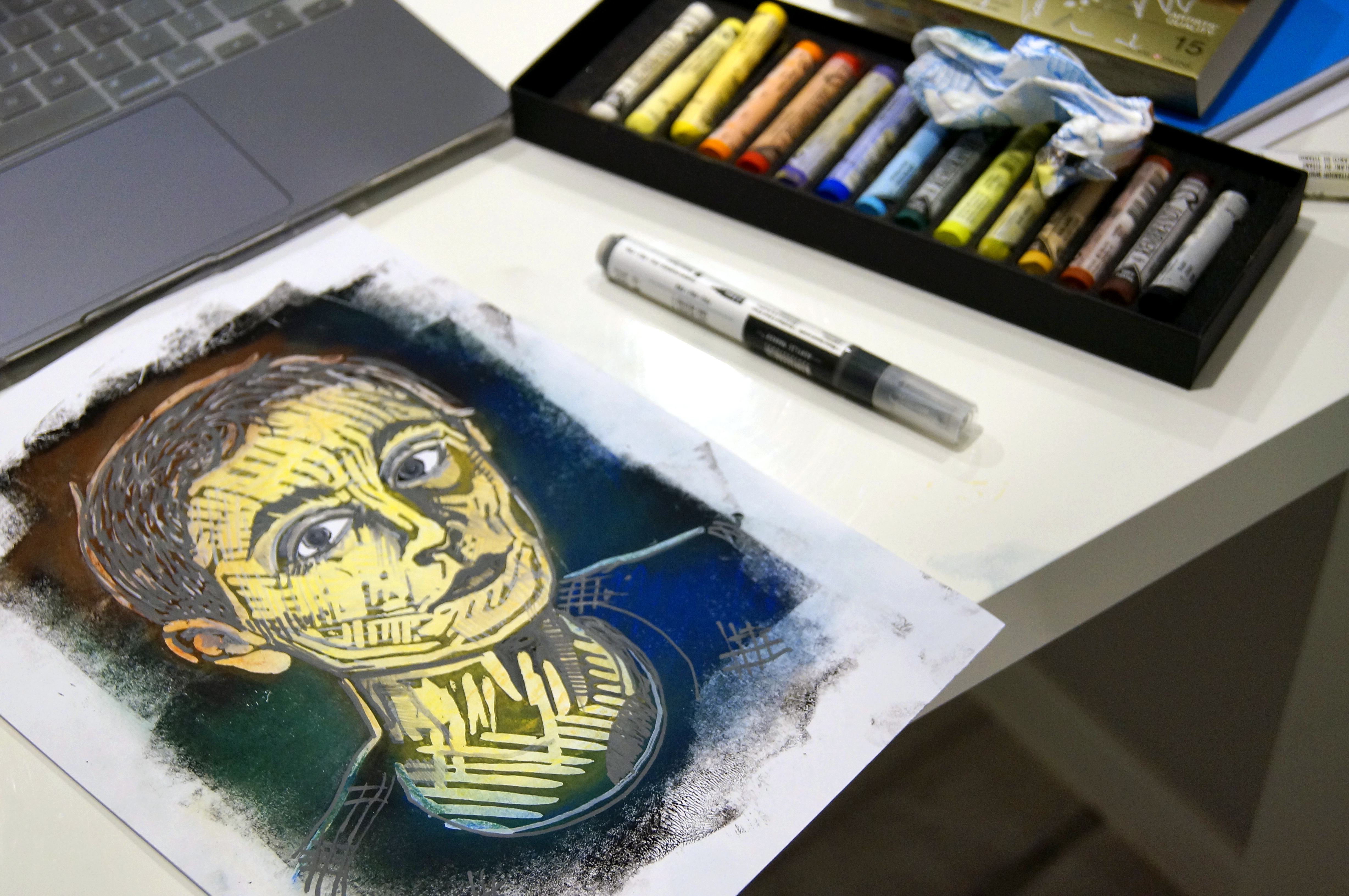 Look is an experiment with different mediums, combining linoleum block printing with acrylic and pastels.